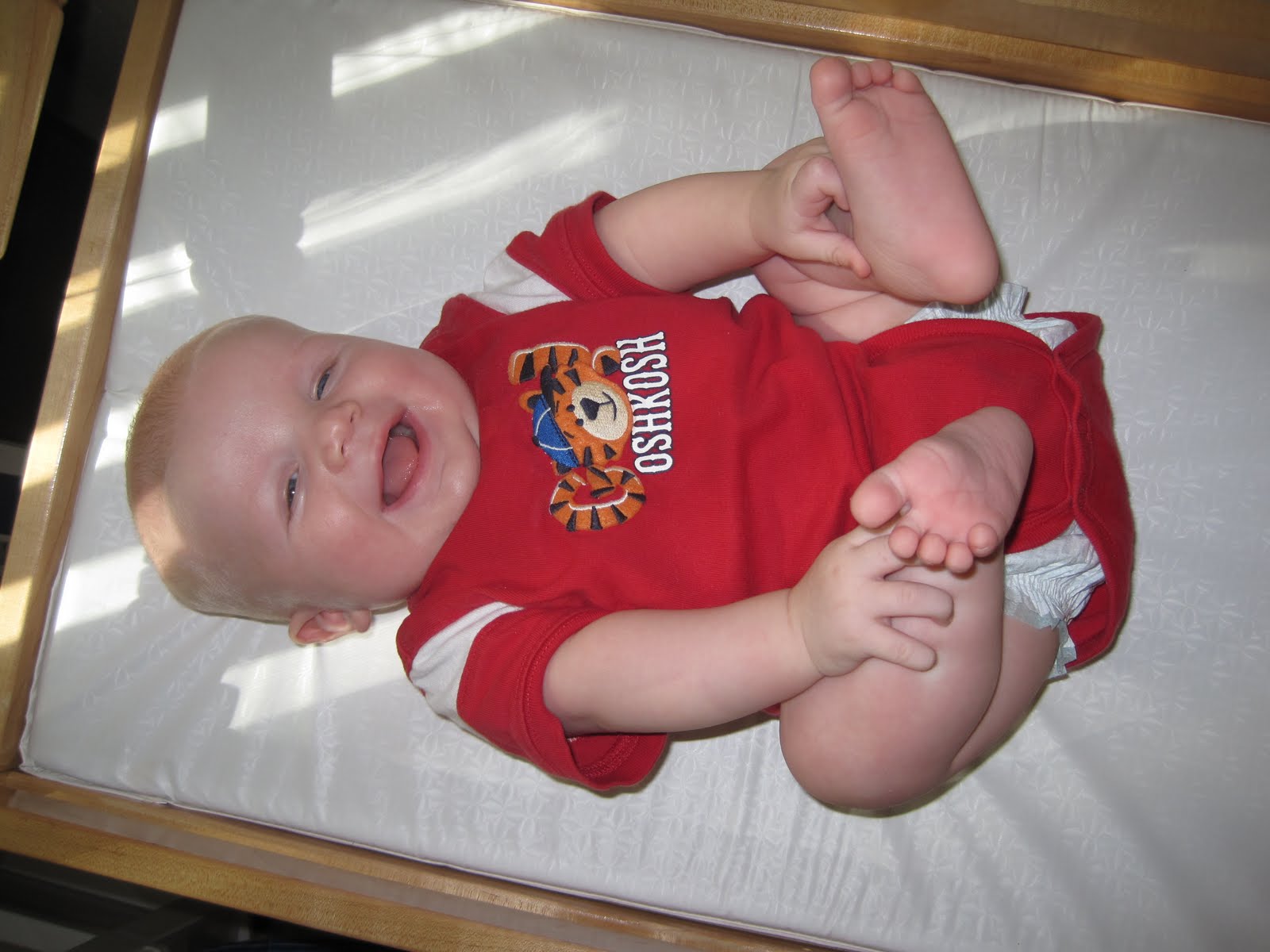 Thomas found his hands this month. He likes to clasp them together and watch them. He is still a very happy baby and smiles all the time.